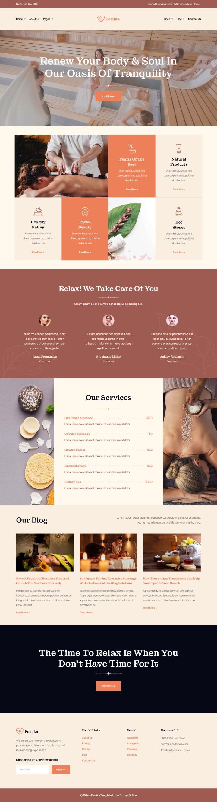 Тема WordPress ThemeForest Femika разработана специально для центров отдыха и учреждений здоровья, с акцентом на использование с Elementor. Данная тема отличается стильным и современным дизайном, с упором на улучшение онлайн-присутствия бизнесов спа и продвижение расслабления и омоложения. Ее интуитивный макет и настраиваемые элементы позволяют легко демонстрировать услуги, удобства и специальные предложения эффективно потенциальным клиентам, ищущим тихое убежище.