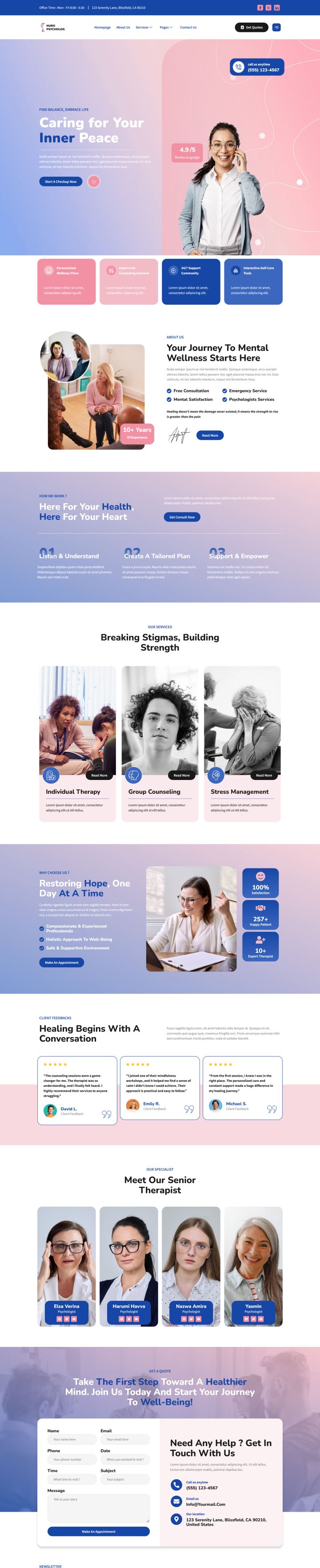 Визуальная подача контента в теме ThemeForest Nuro реализована так, чтобы акцентировать внимание посетителя на ключевых услугах, персоналиях специалистов и ценностном предложении центра. Главная страница оформлена в виде приветственного экрана с ненавязчивым, но цепляющим call to action: посетитель сразу видит ключевые виды помощи, указания на лекарственное и терапевтическое сопровождение, а также возможности для записи на первичную консультацию онлайн. Нижние блоки сопровождают тематическими иконками, иллюстрирующими направления - тревожные расстройства, семейные проблемы, индивидуальную и групповую терапию.