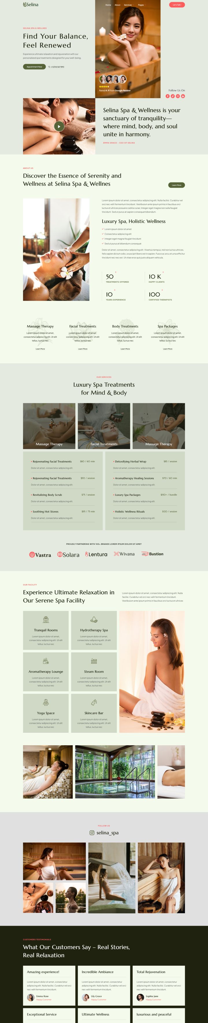 В данном решении акцент делается на современной эстетике, характерной для индустрии релакса и велнеса: в визуальных блоках грамотно обыгрываются светлые, спокойные оттенки, минимализм и гармоничные акценты. Шрифты тщательно подобраны для создания эффекта комфорта, читабельности и доброжелательности. Расположение ключевых элементов - таких как формы записи, презентационные баннеры с услугами, слайдеры отзывов и секции с акциями - формирует логичный и привлекательный путь пользователя по сайту. Использование функциональных секций подчеркивает универсальность темы для продвижения уникальных спа-услуг, авторских массажных методик, программ оздоровления и эксклюзивных косметологических процедур.