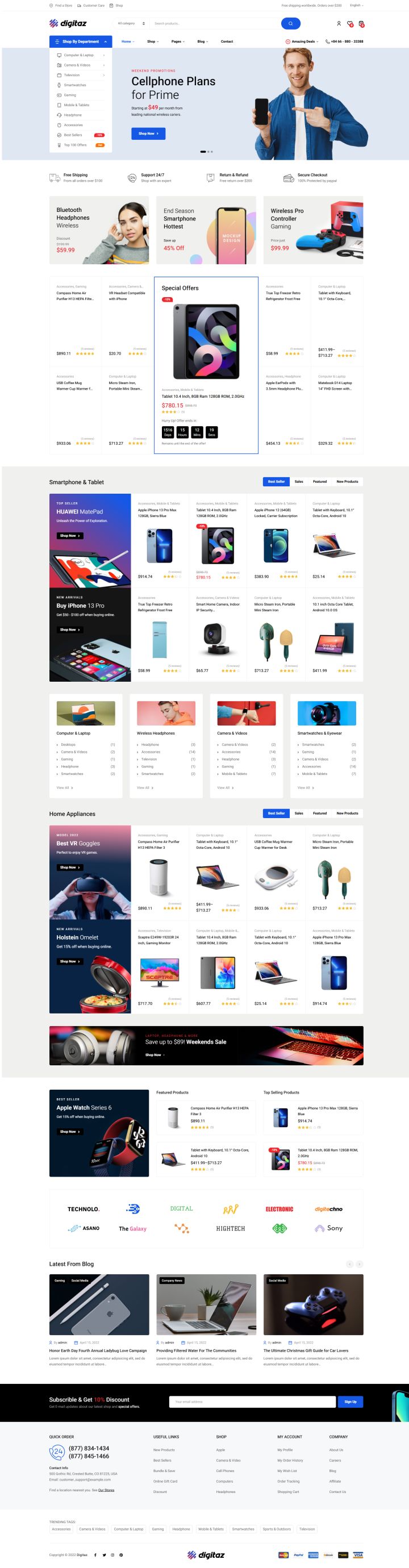 ThemeForest Digitaz - это современная тема для WordPress, разработанная специально для интернет-магазинов, специализирующихся на электронике и цифровых товарах. Решение предлагает широкий спектр инструментов, упрощающих запуск и последующее управление сайтом, ориентированным на продажи устройств и аксессуаров. Минималистичный интерфейс сочетается с интеграцией WooCommerce, обеспечивая высокий уровень адаптивности к потребностям электронной коммерции. Визуально привлекательное оформление и чистая структура помогают создать доверие у посетителей интернет-магазина. Сам шаблон предоставляет полный базовый набор для мощной витрины товаров, начиная с многоуровневой навигации и заканчивая интуитивно понятной корзиной.